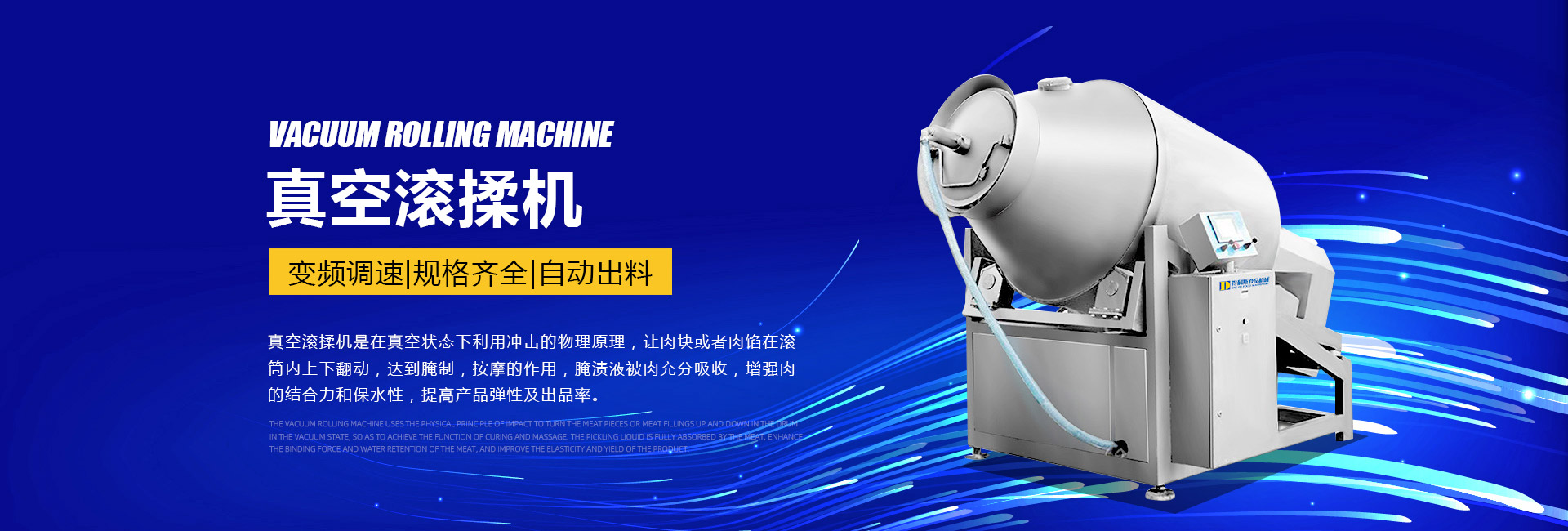 公司主要生產(chǎn)不銹鋼制品食品機械:各種規(guī)格型號真空滾揉機、制冷滾揉機、提升機、電加熱夾層鍋、肉丸機、真空攪拌機、絞肉機、灌腸機、打卡機、線扎機、斬拌機、鹽水注射機、煙熏爐、油炸機、巴氏殺菌線、連續(xù)油炸線、肉丸成型水煮線、醬鹵生產(chǎn)線、肉丸破碎機、真空包裝機、洗袋風干機、豬頭劈半機、不銹鋼火腿模具、肉斗車、案桌、煙熏車、屠宰類機械設備、清洗風干設備、肉類解凍設備、滾筒拌料機等。產(chǎn)品廣泛適用于火腿腸、肉丸、肉串、鹵制品、海產(chǎn)品、禽類深加工、油炸、泡椒風味、速凍水餃、魚豆腐、千葉豆腐、豆腐干、牛肉干、牛排雞排類、禽蛋、麻辣、休閑、水果蔬菜清洗、中央廚房、餐飲連鎖、寵物食品等食品生產(chǎn)。